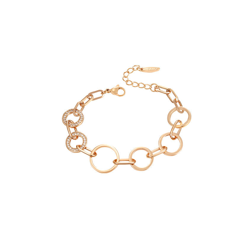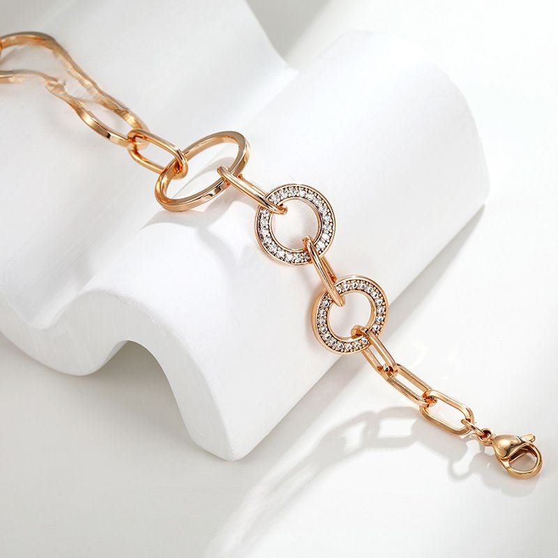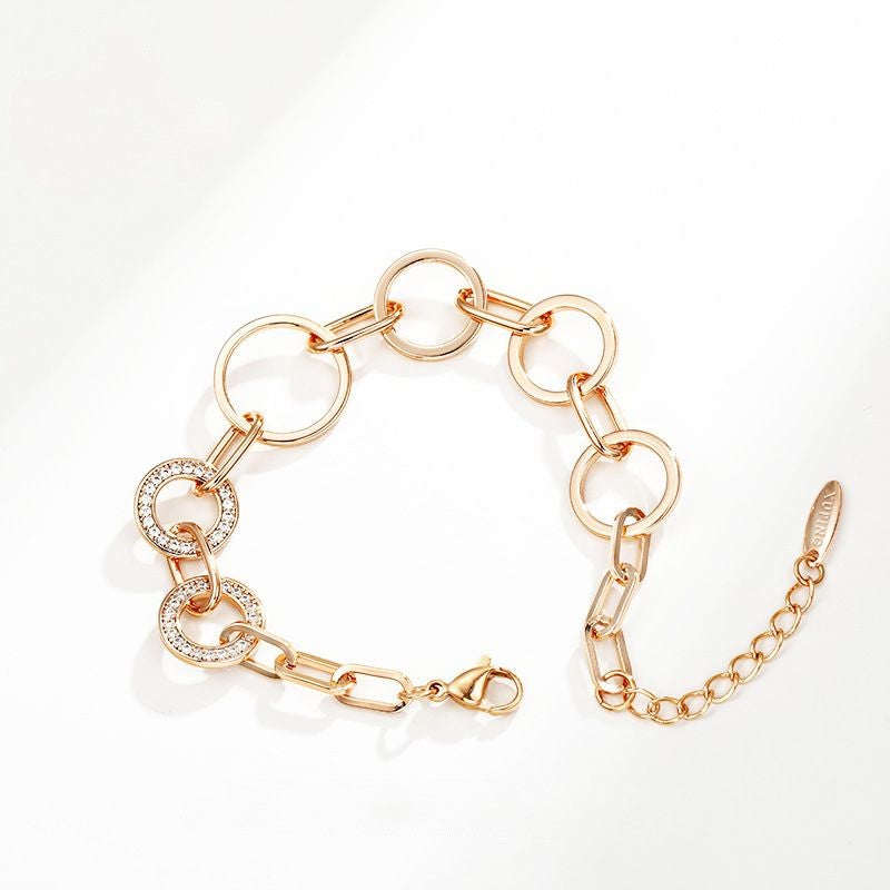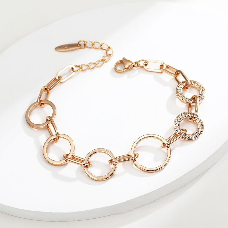 The bracelet features a unique stitching design with different sizes of chain, adding an element of visual interest and complexity to the piece. Despite its complexity, the bracelet retains an overall simplicity, making it perfect for both everyday wear and special occasions such as parties or weddings.