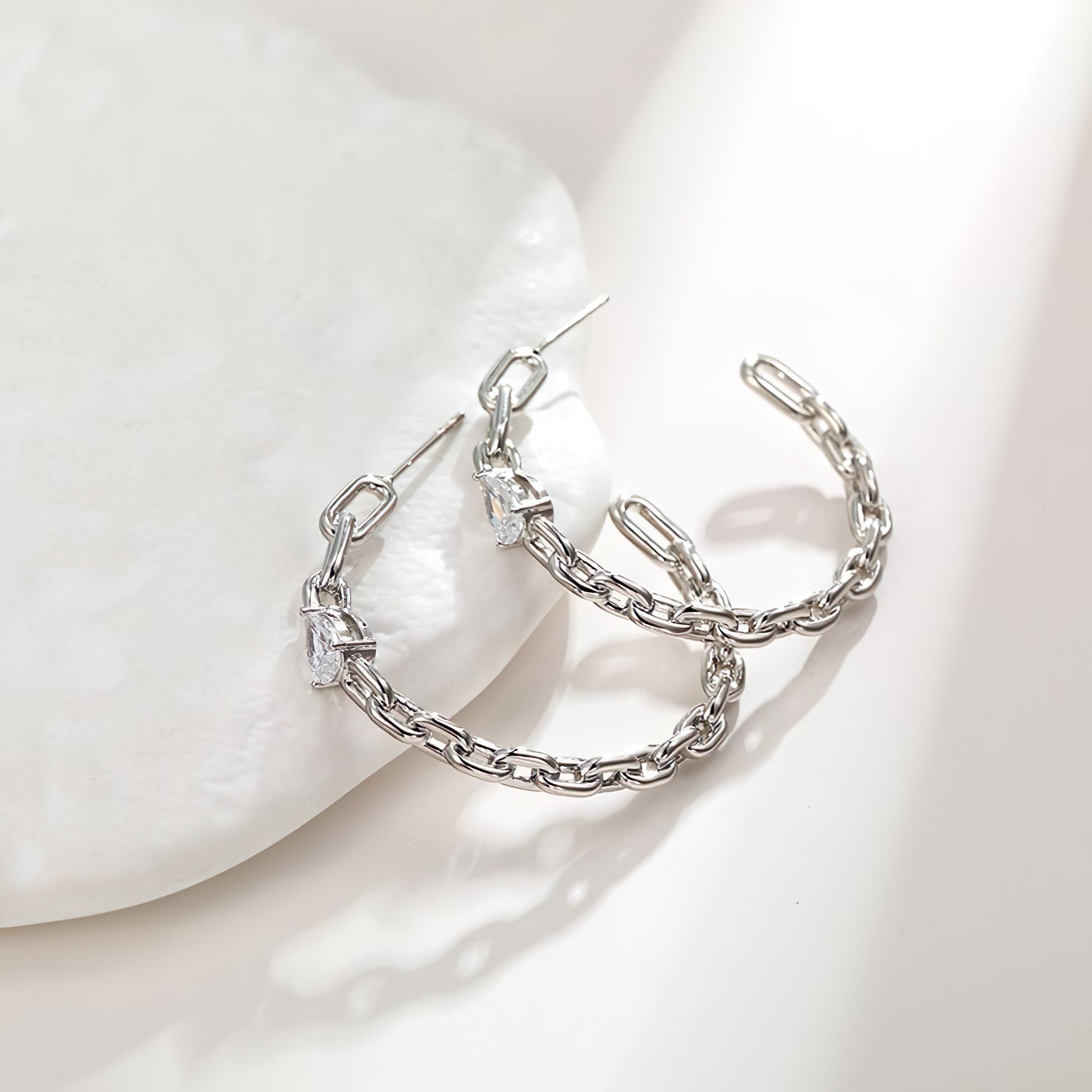 Introducing our stunning Letter C Earrings, the perfect addition to any jewelry collection. Crafted from high-quality stainless steel and plated with lustrous silver, these earrings feature an exquisite chain design that is sure to catch everyone's eye.