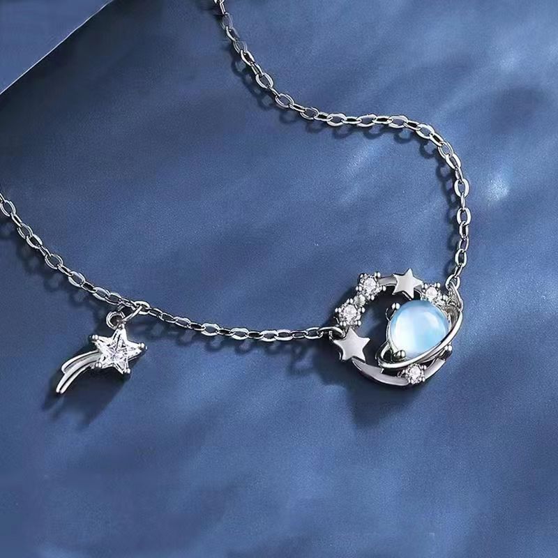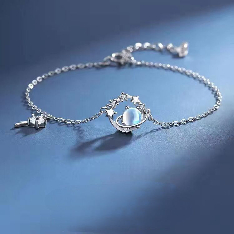Introducing our stunning Moonstone Planet Bracelet, the perfect addition to any space collection. Made with high-quality brass and plated with 925 silver, this bracelet features a beautiful planet design with moonstone and zircon spark that will leave you mesmerized. With its unique property, the moonstone will show different colors depending on the angle it's viewed from, making each piece truly one-of-a-kind.