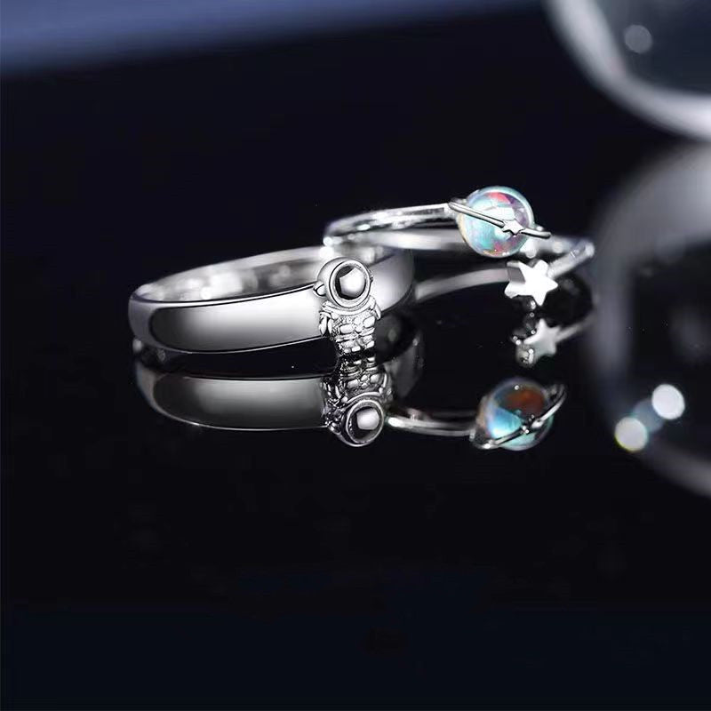 The moonstone spark adds a touch of celestial elegance to these rings, and the different angles create an ever-changing appearance that is sure to impress. These couple rings are adjustable and unisex, making them a perfect choice for anyone. The planet is slightly smaller than the astronaut, adding a subtle touch of distinction.